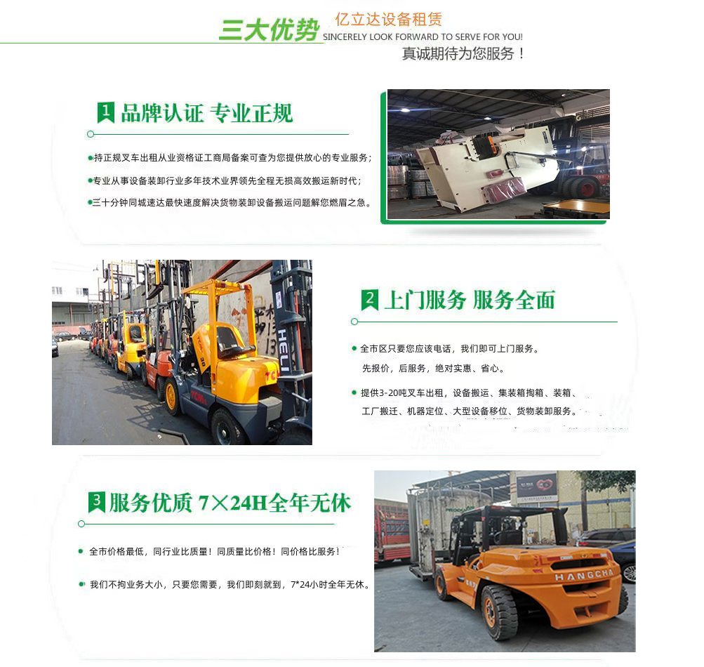 亿立达设备租赁有限公司是工商局准许的天津交通职业学院专业叉车出租公司,公司本着诚信、服务、效率、创新的经营理念,用精湛的技术,真诚的服务,为众多客户提供优质的服务,同时获得信赖与支持。专业提供天津交通职业学院3-20吨叉车出租、叉车租赁、设备搬运、集装箱掏箱装箱、机器移位定位、货物装卸、工厂搬迁、安全可靠,收费透明,价格便宜,随叫随到,24小时上门服务!本公司叉车吊车师傅对各种设备搬运装卸都有深刻探讨和研究。很多的疑难设备搬运,通过我公司的叉车师傅都能迎刃而解。对各种进口设备、国产机器、大型设备搬迁、高难度搬迁、各种精密仪器、医疗设备、科研设备等都能搬运; 提供全市 24 小时上门装卸搬运服务。同时提供厂房搬迁服务。 ...